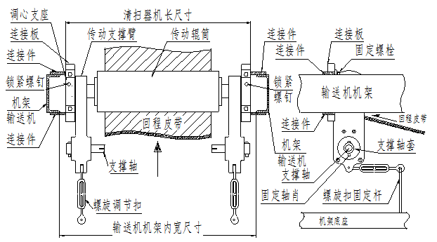 3.检查“调心支座”与“连接板”的位置是否正确,螺栓应处在长孔中间的位置。为调整“传动辊筒”对“回程皮带”的压下量预留足够余量。